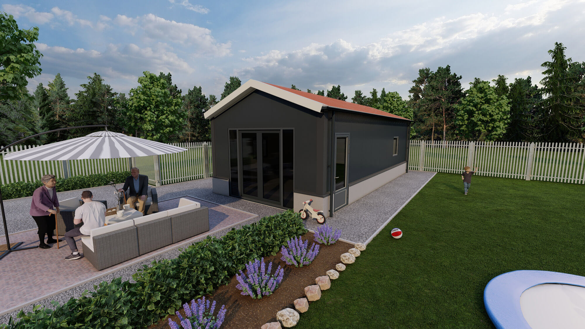 De casco mantelzorgwoning type Anson-M van 50m2 is een geweldige oplossing voor degenen die op zoek zijn naar een betaalbare en flexibele woning met veel mogelijkheden. De afmetingen van 5 bij 10 meter bieden voldoende ruimte voor uw comfort en welzijn. De goothoogte van 3 meter en de nokhoogte van 5 meter geven een gevoel van ruimte en licht.